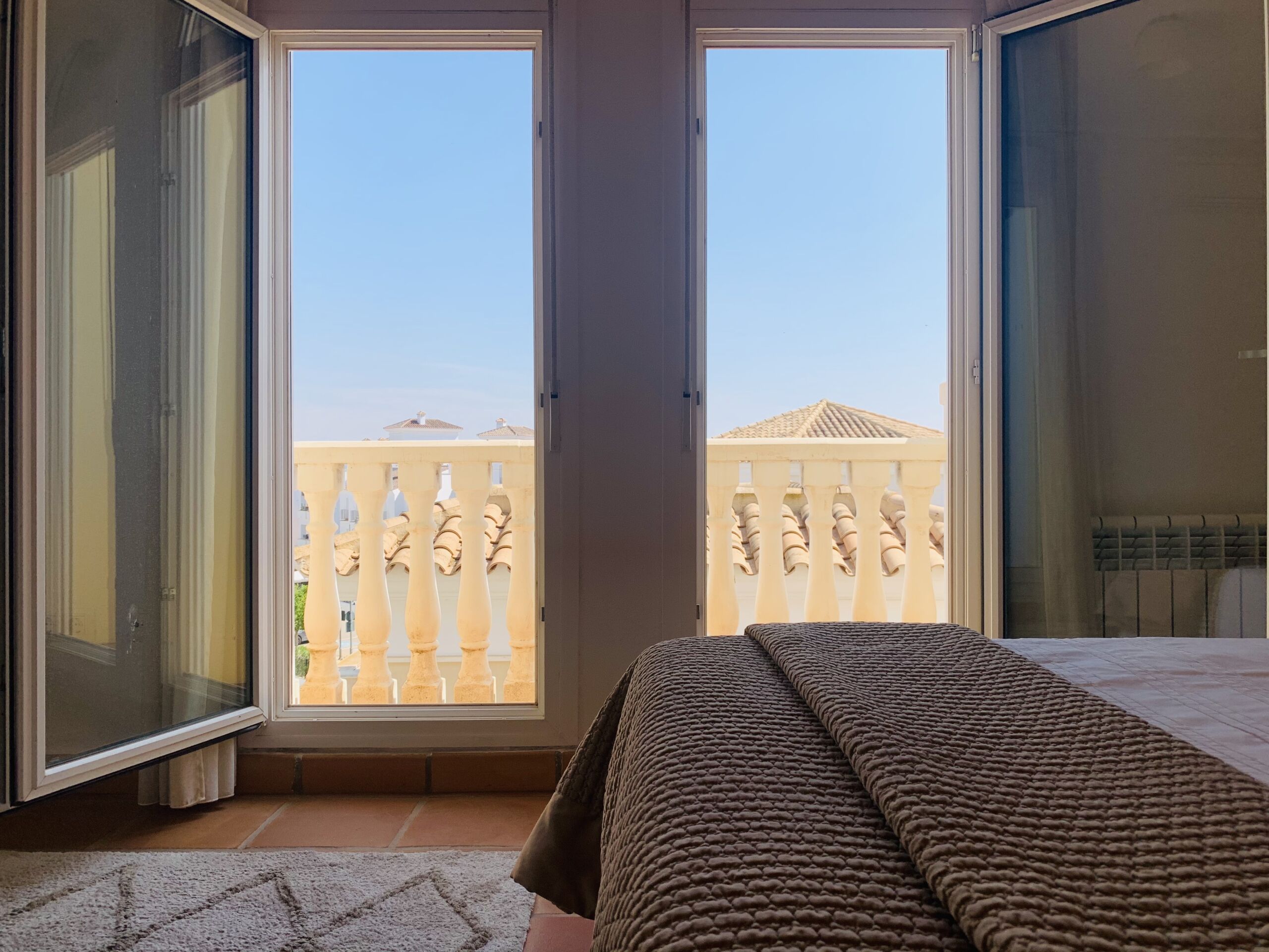Both bedrooms are fitted with large fitted wardrobes & Air-conditioning. The large main double bedroom is flooded with light from 2 sets of French doors, one set leading to the main terrace.