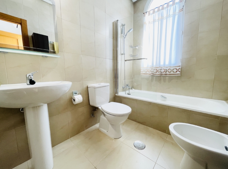 Inside, the villa offers a bright and spacious layout. The well-appointed kitchen is complemented by an enclosed utility area, providing excellent practicality. On the ground floor, there is one double bedroom and a full bathroom, ideal for guests or single-level living.