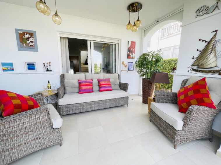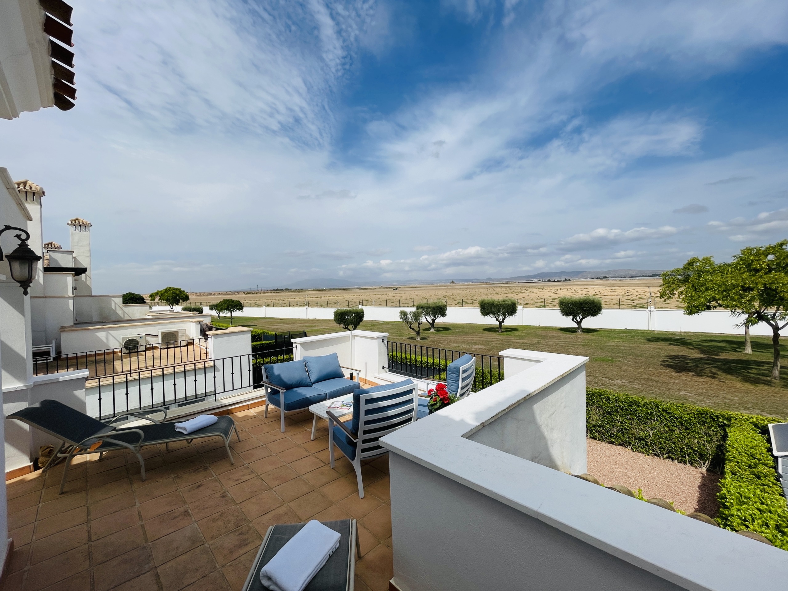 Outside on the 1st floor there is a spacious terrace, which looks over your private garden, communal grass area, countryside & mountains in the distance. From this private terrace you can enjoy the evening sunsets after a day by the pool or at the beach.