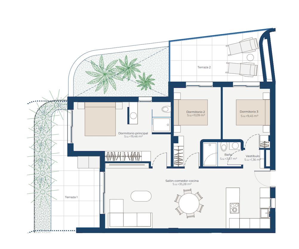 Each apartment has been thoughtfully designed to enhance space, comfort, and natural light. Expansive open-plan living and dining areas connect seamlessly with private terraces, creating the perfect setting for outdoor dining, relaxation, and enjoying views across landscaped gardens, the communal pool, or the championship golf course, all under Murcia’s famous year-round sunshine.