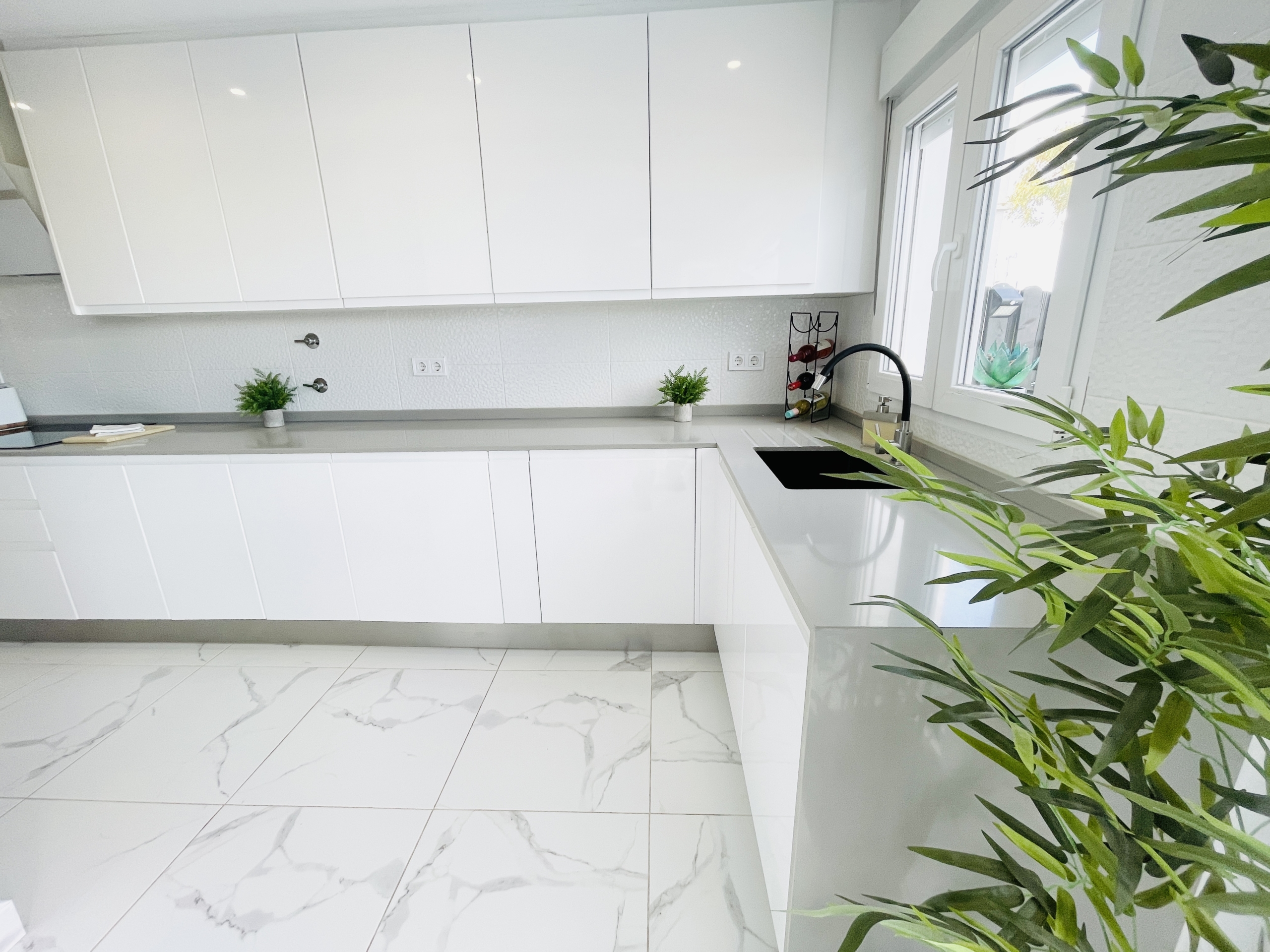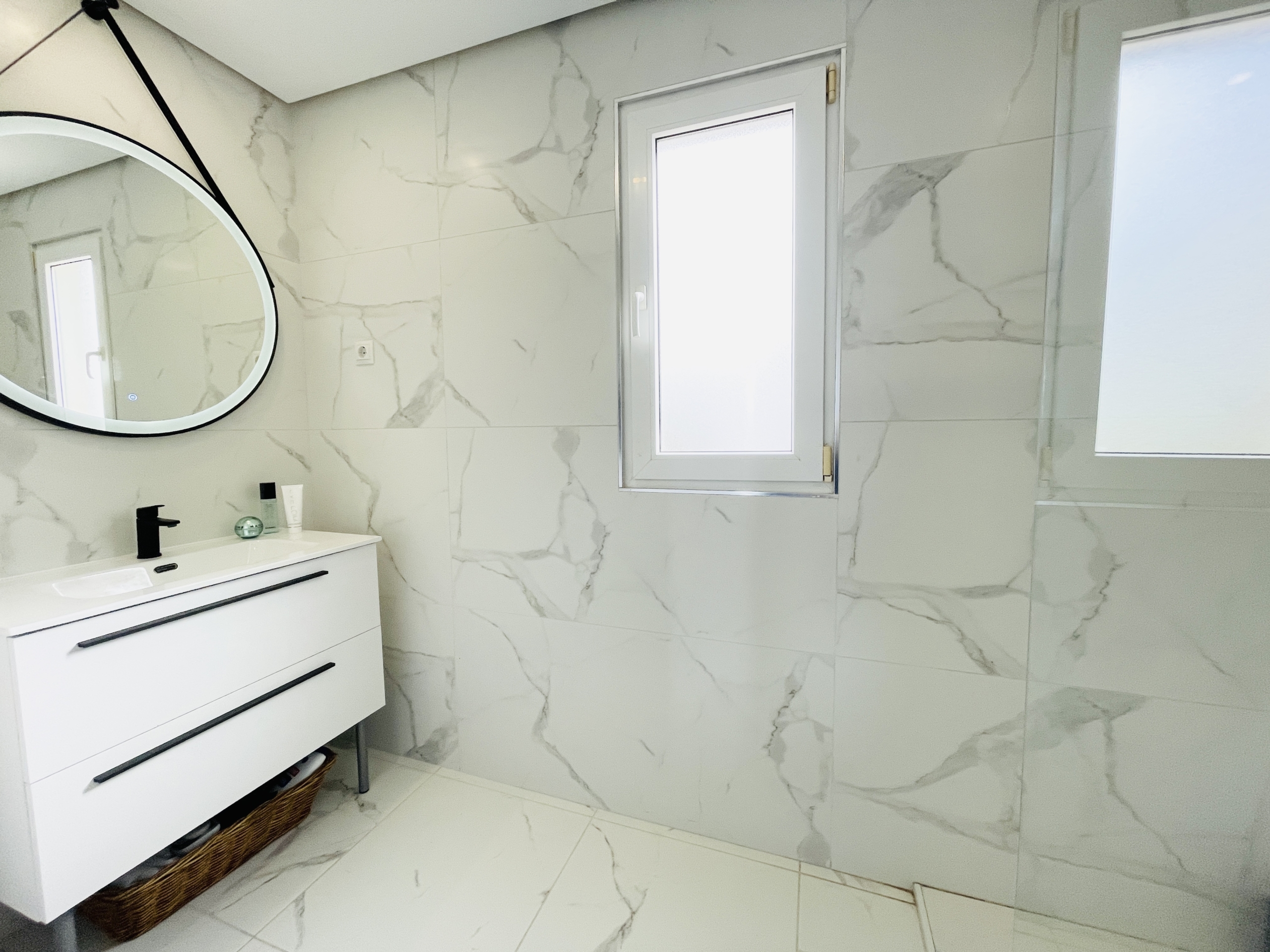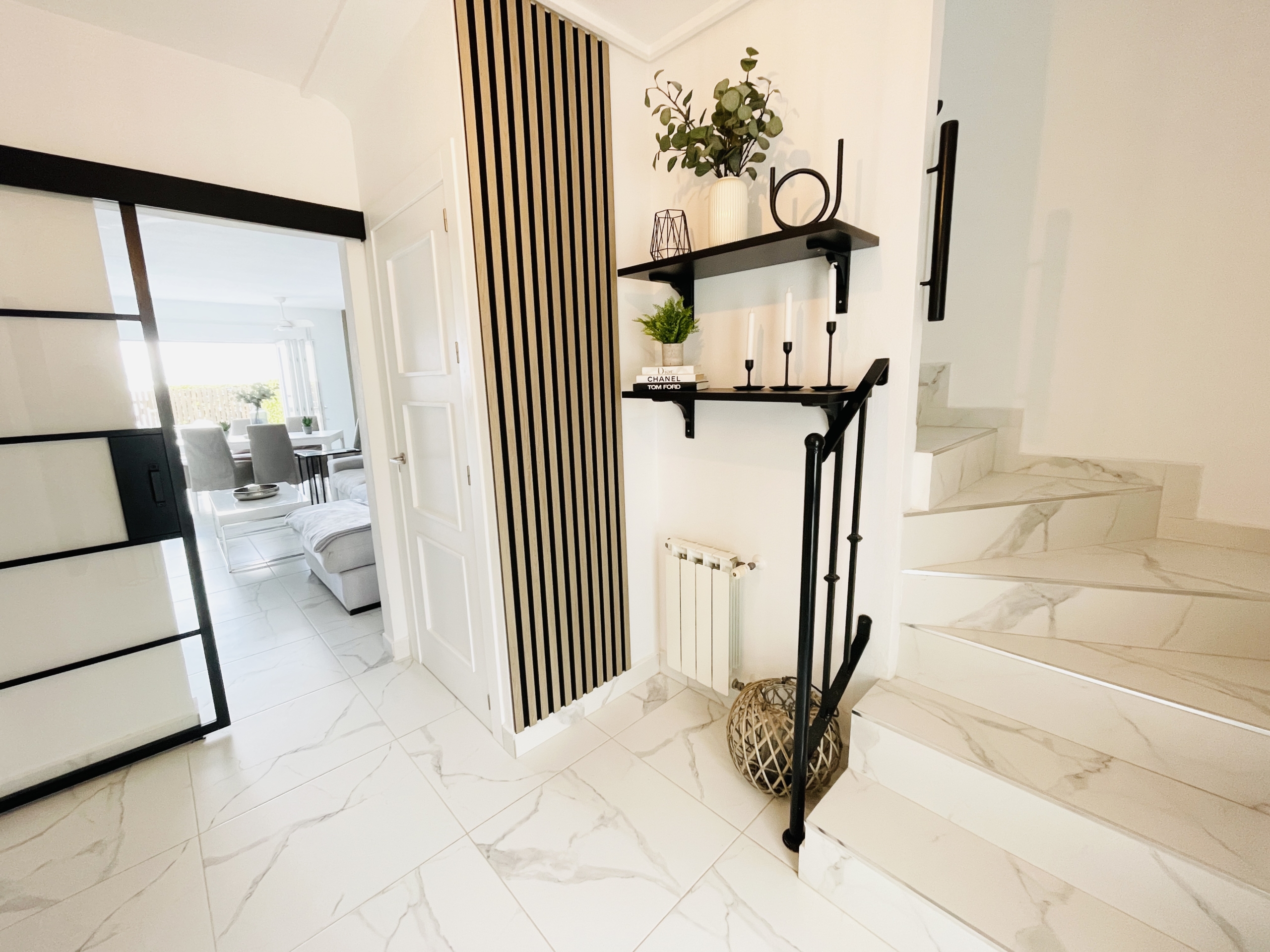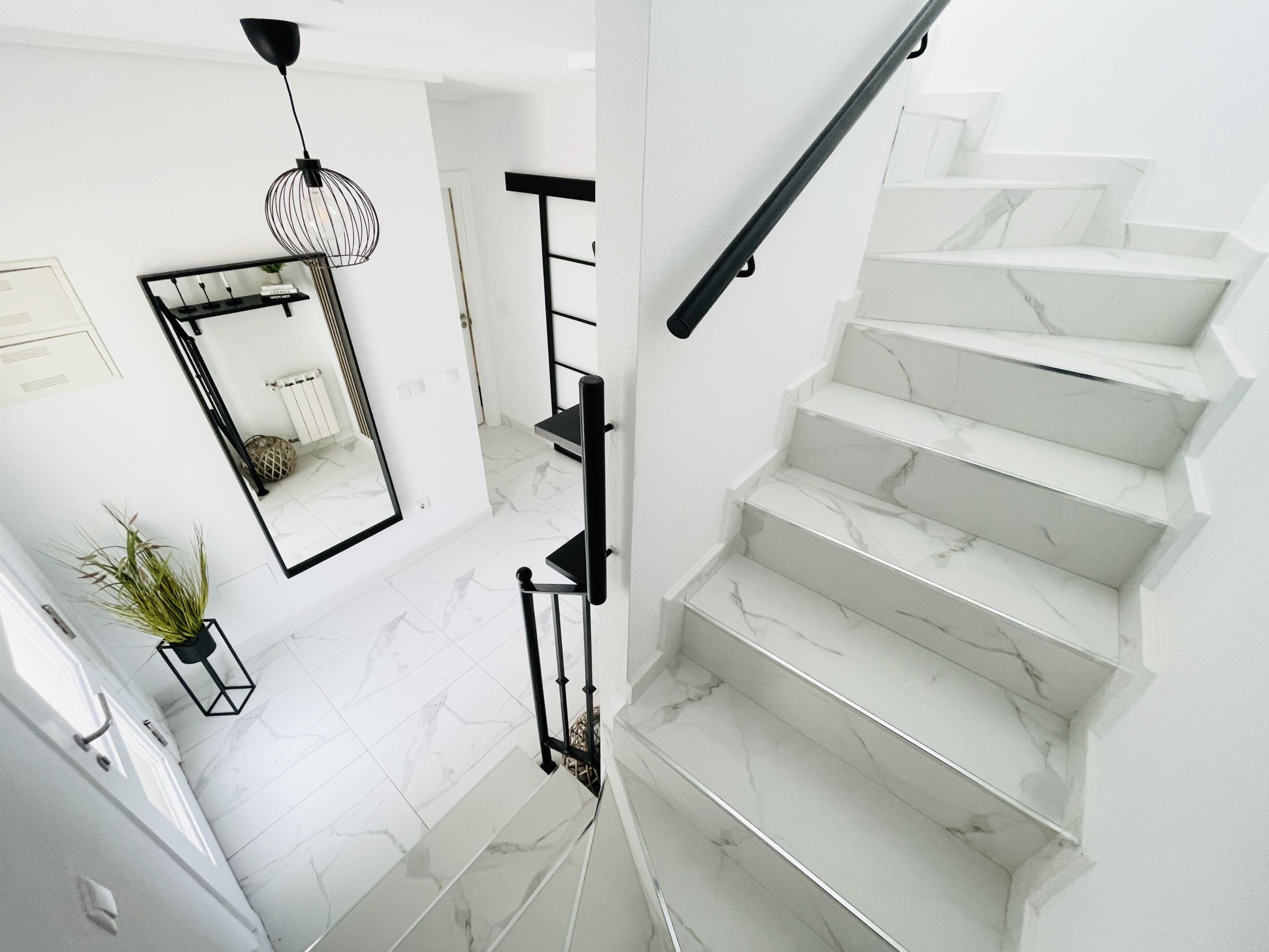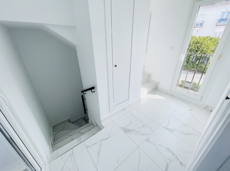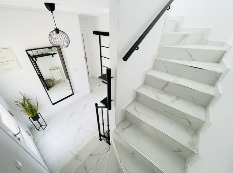 The property has been fully upgraded to an impressive modern standard, with new white and grey marble-effect floor tiling throughout, creating a sleek, contemporary feel that flows seamlessly across all levels.
