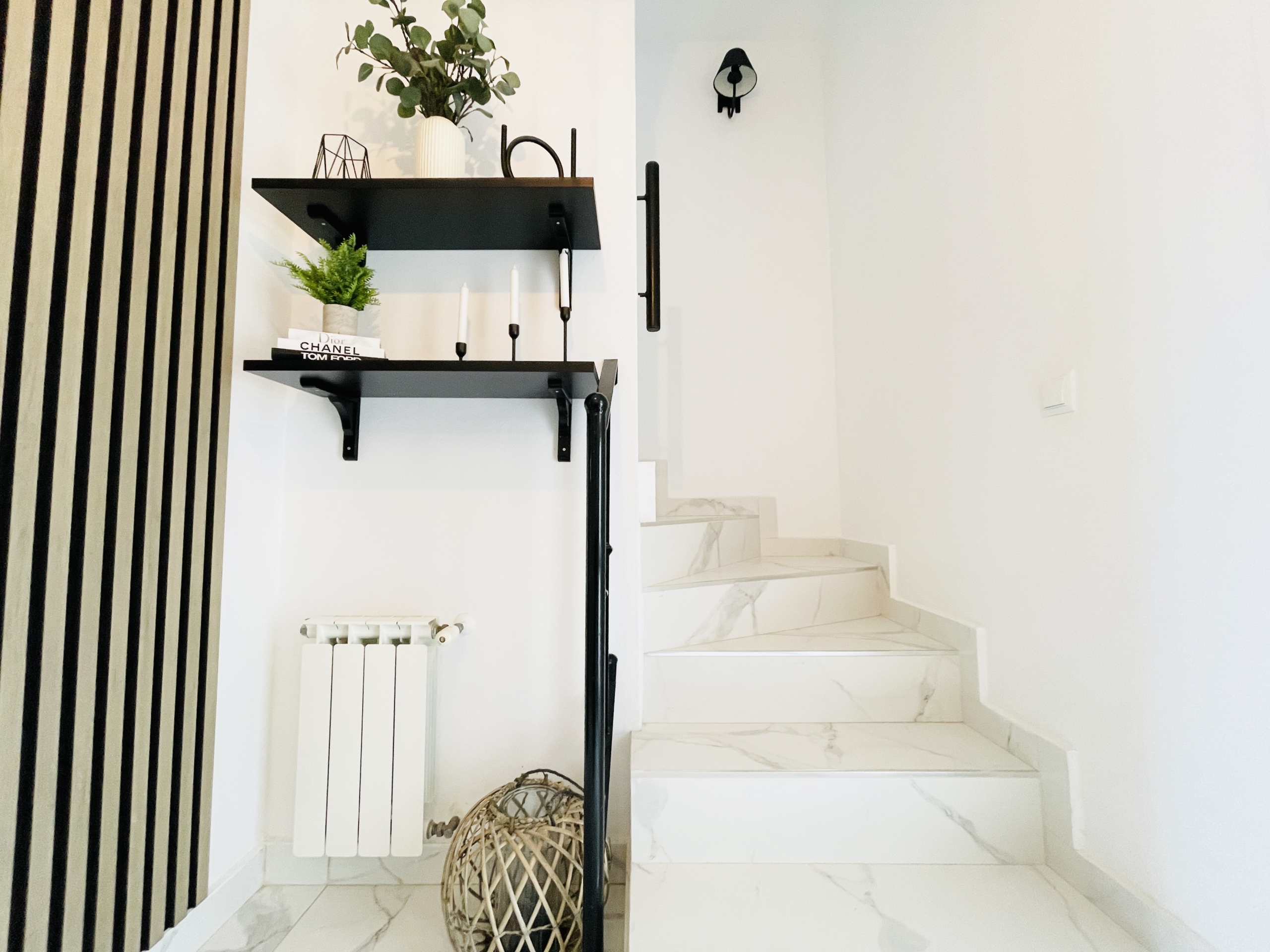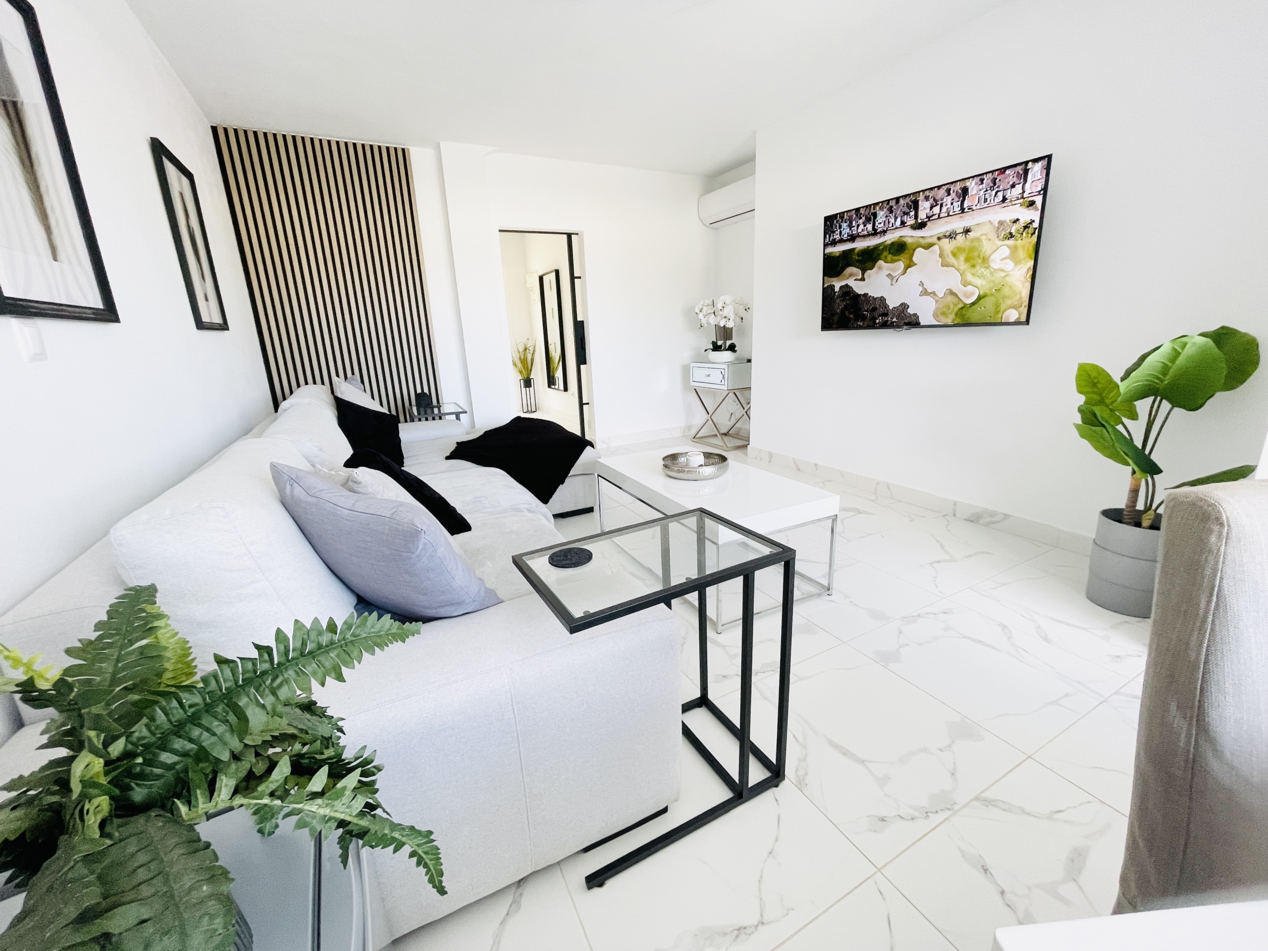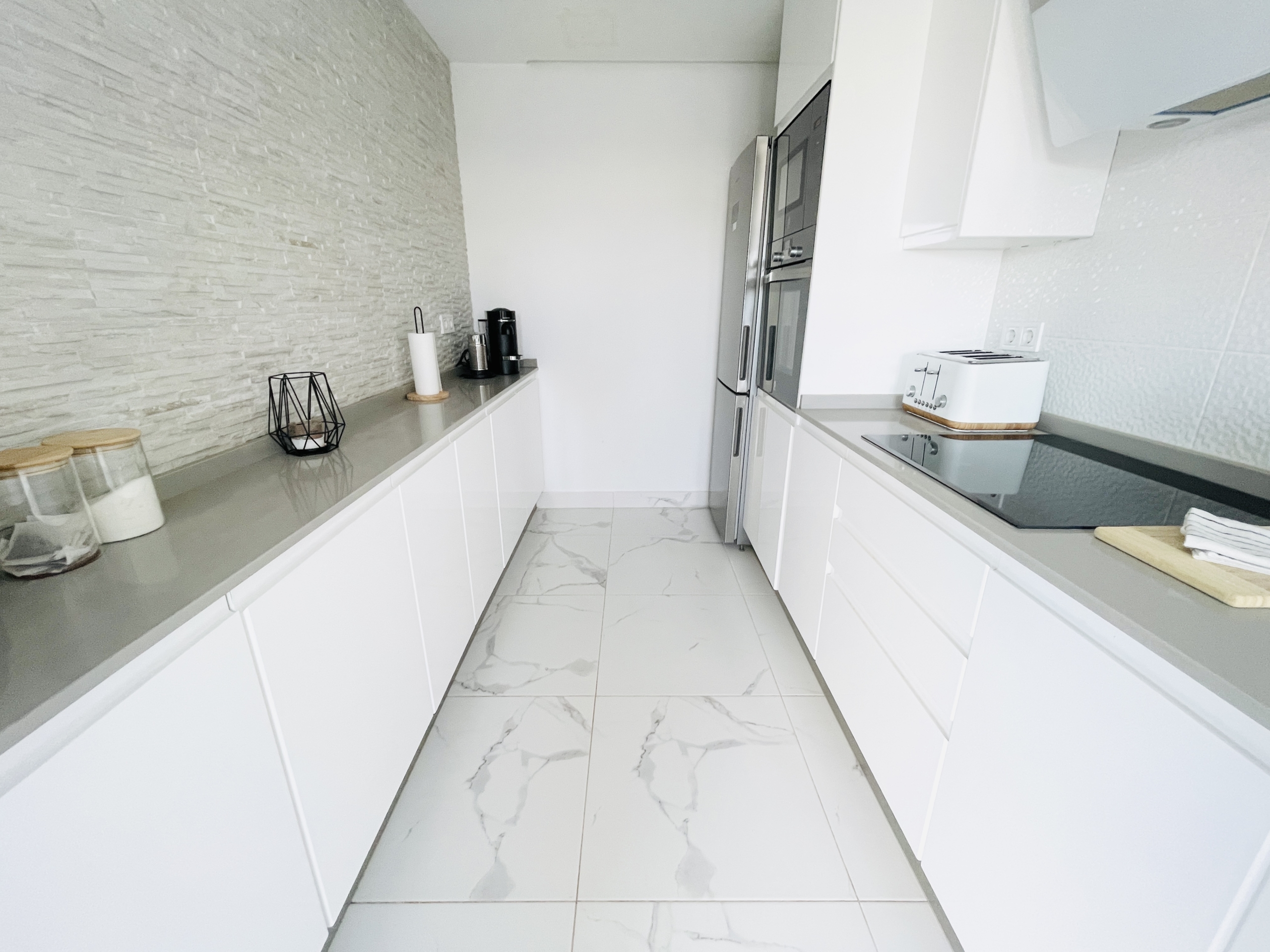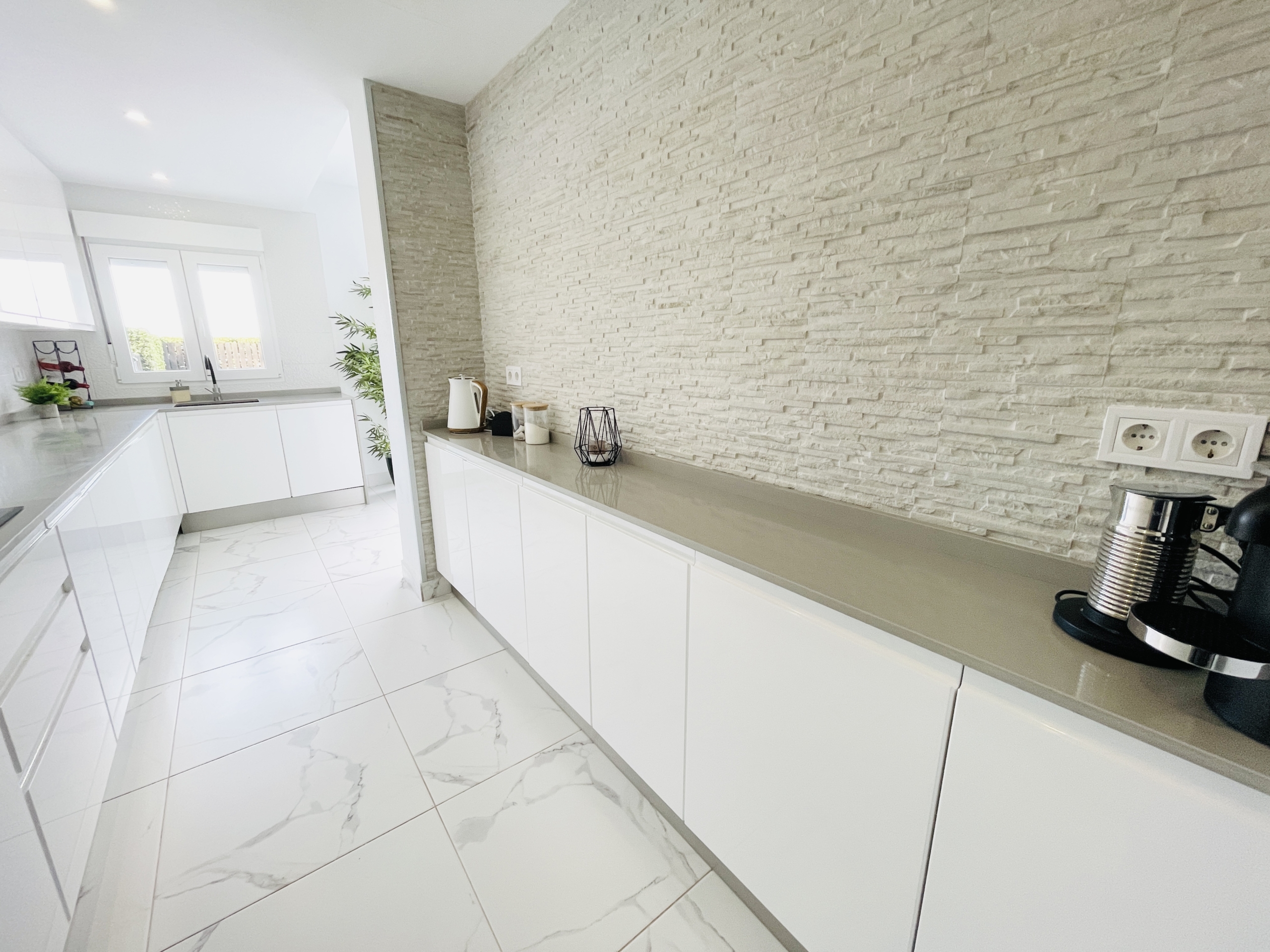 The property has been fully upgraded to an impressive modern standard, with new white and grey marble-effect floor tiling throughout, creating a sleek, contemporary feel that flows seamlessly across all levels.