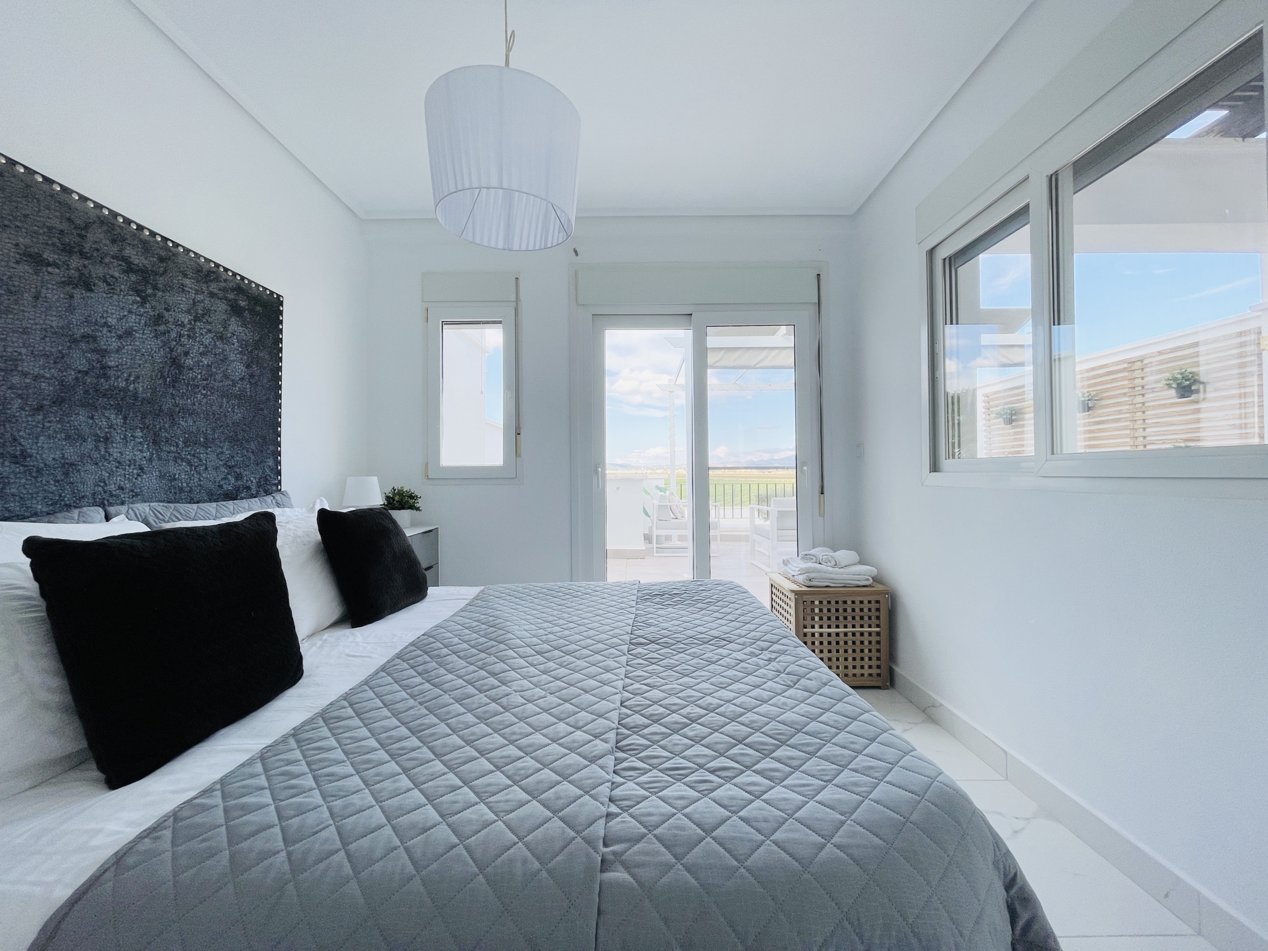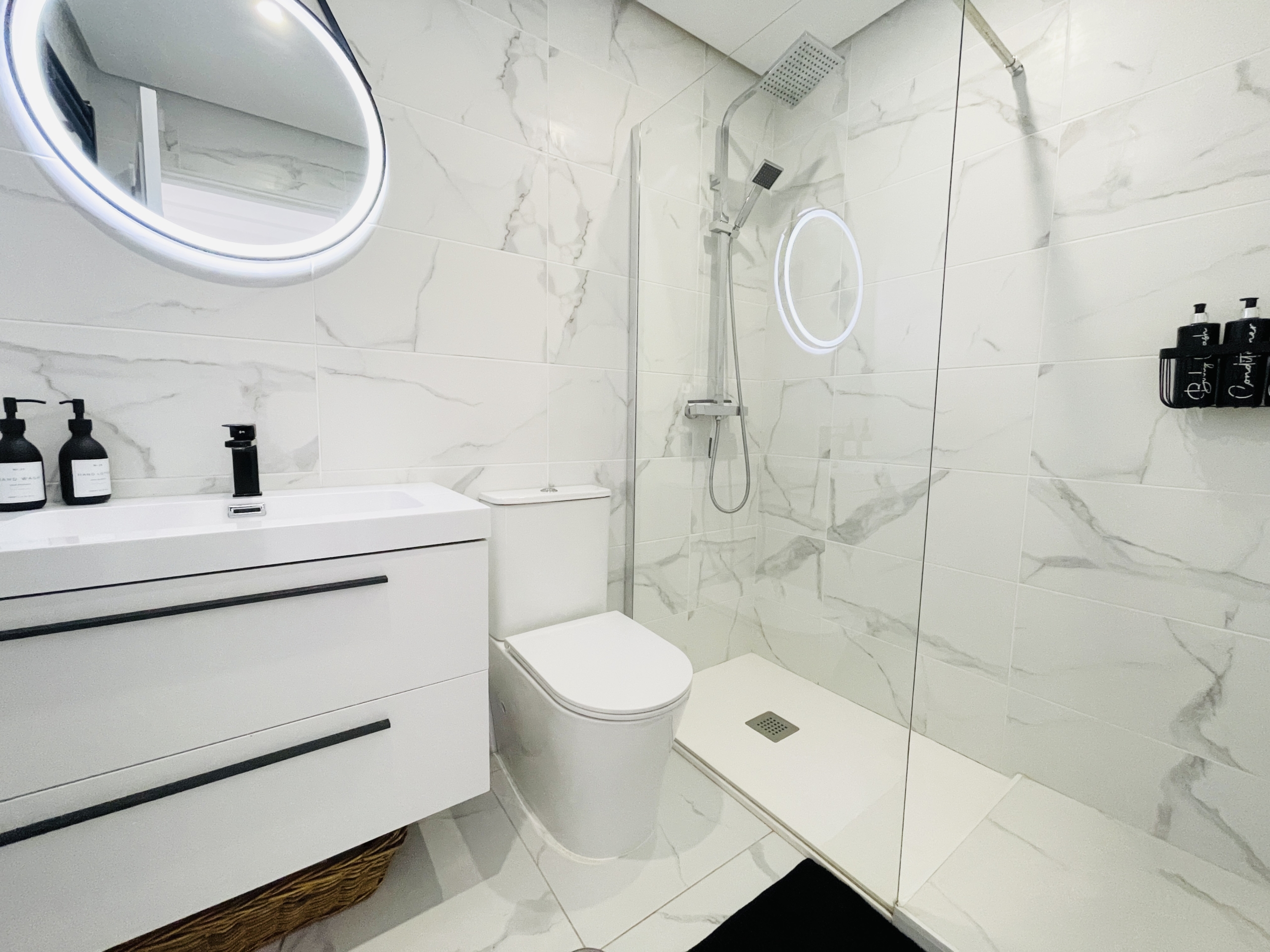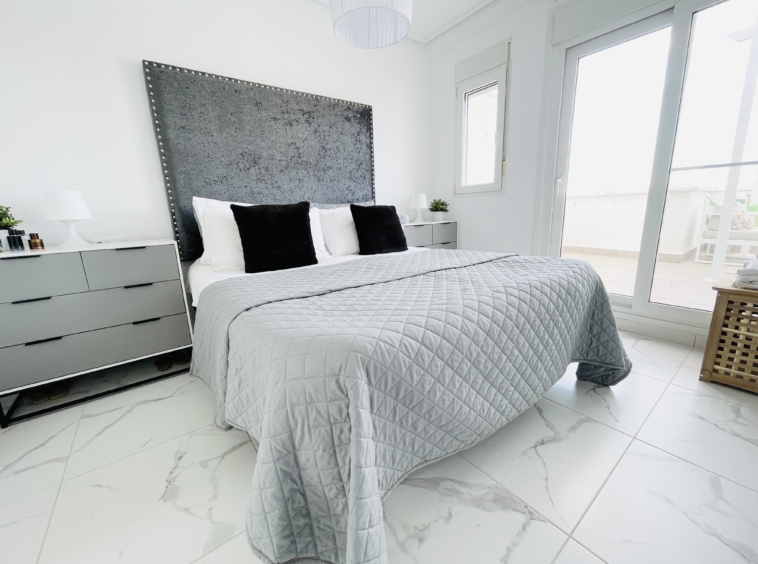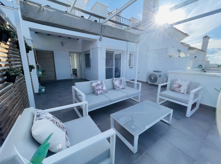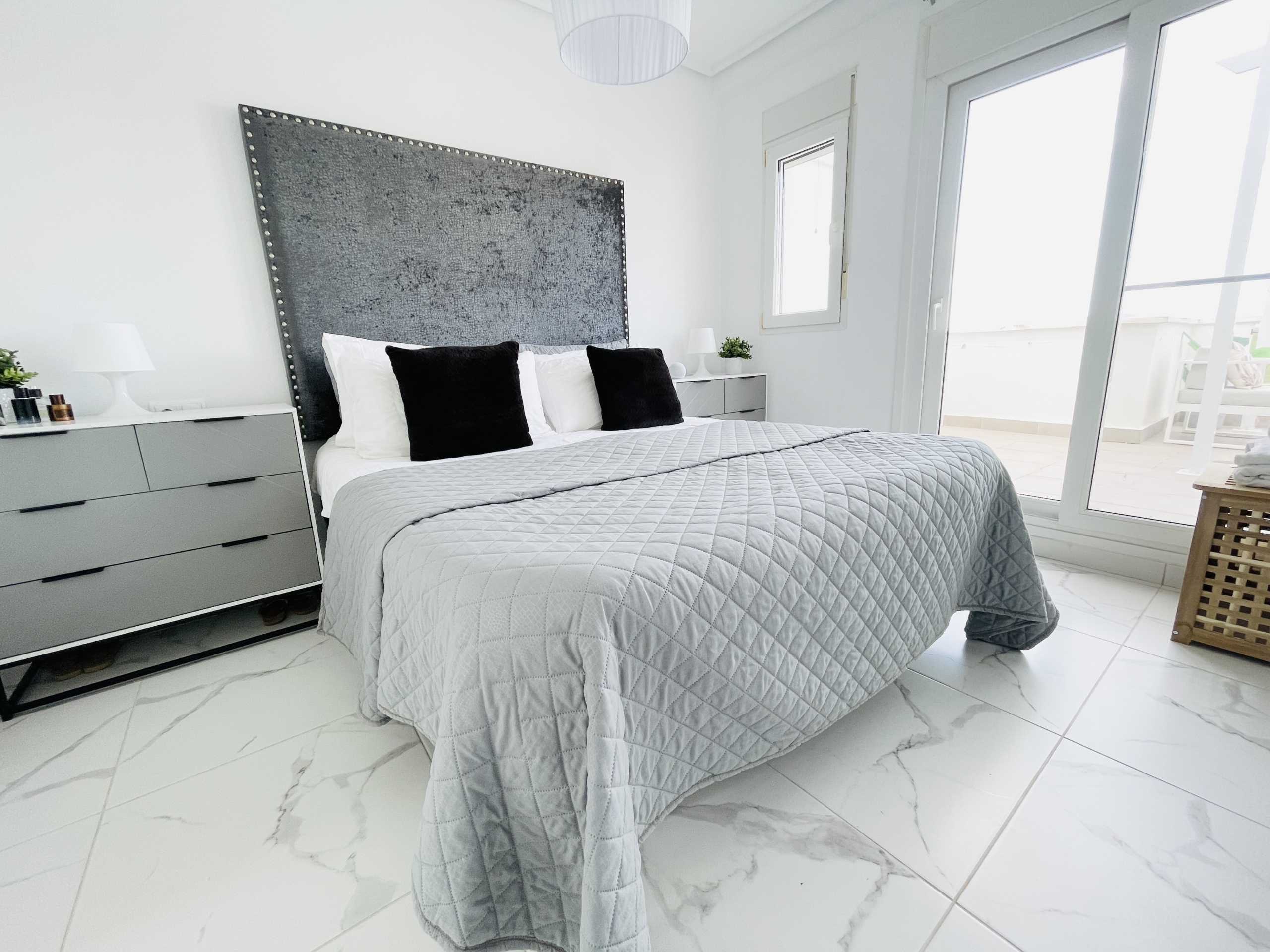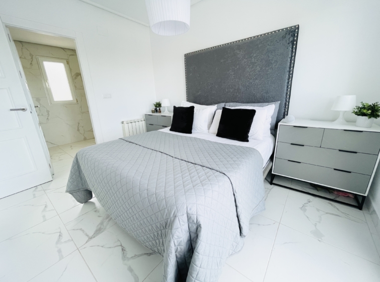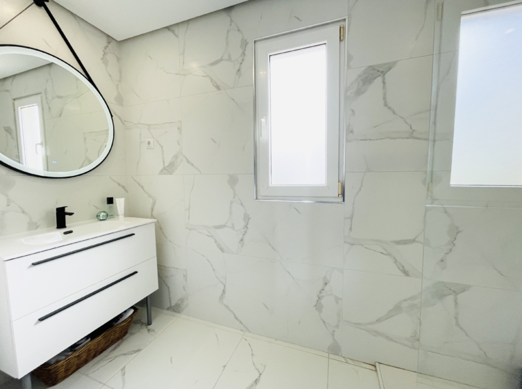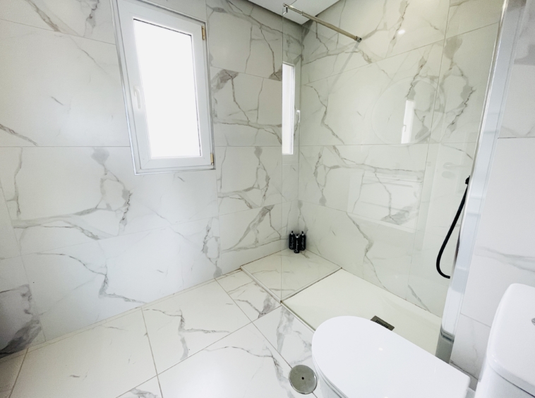 Upstairs, the marble-effect flooring continues into the spacious main bedroom and modern en-suite bathroom. This level also benefits from a large private terrace, offering ample space for seating and relaxation.