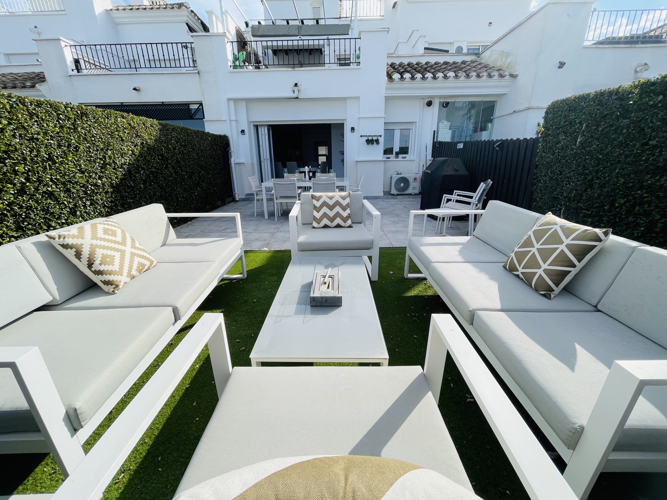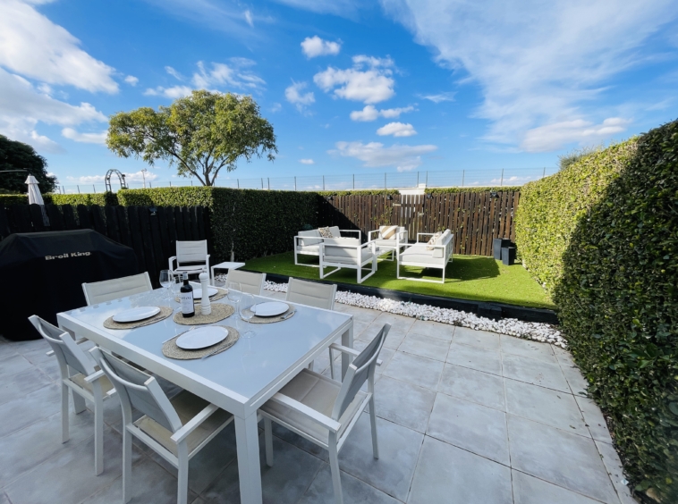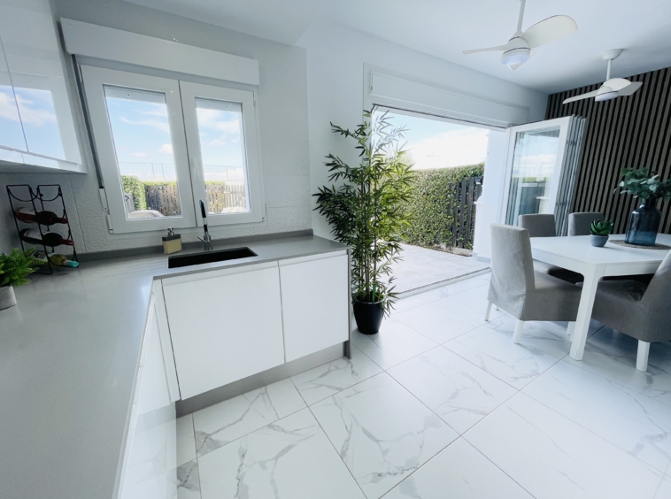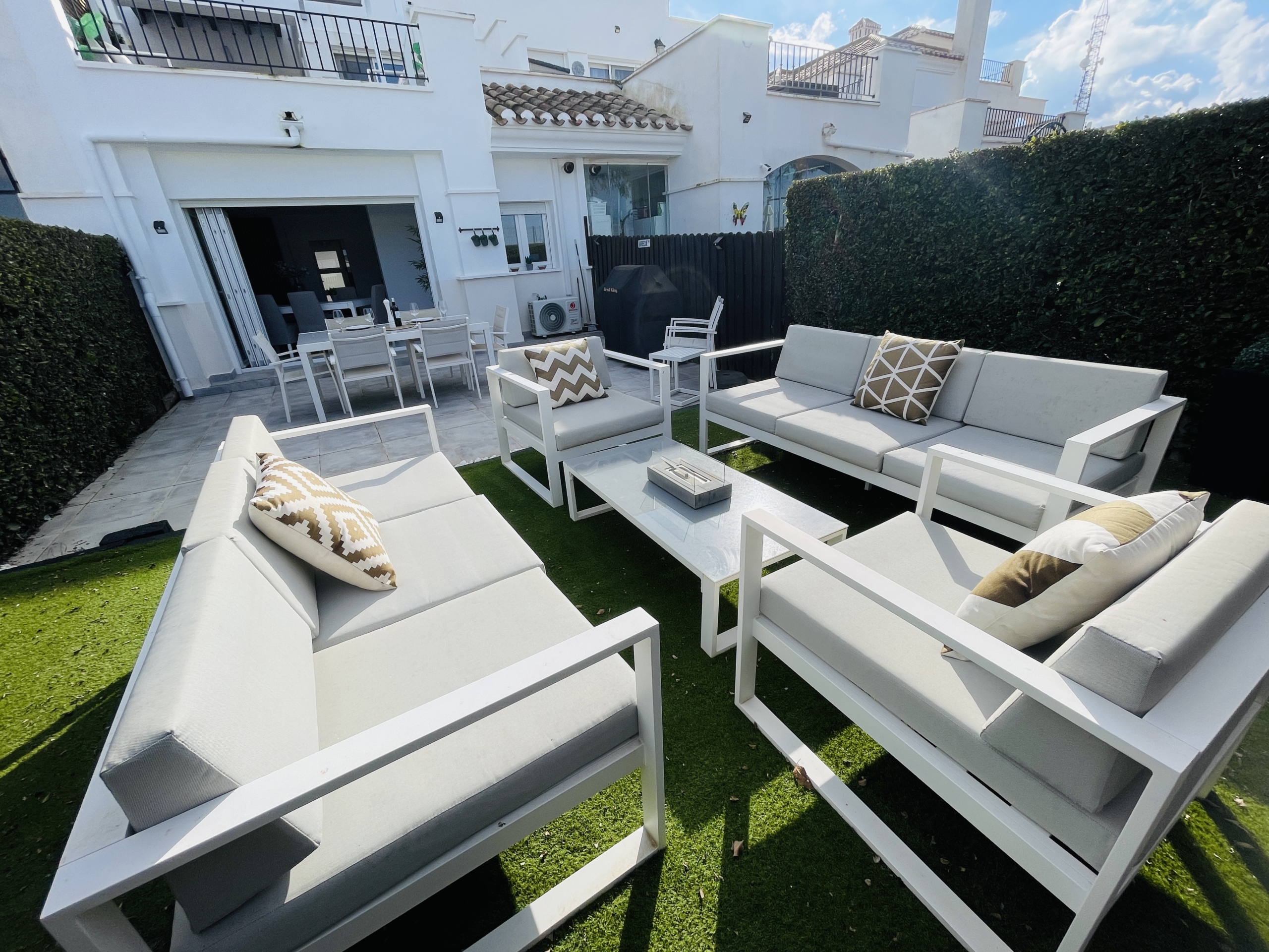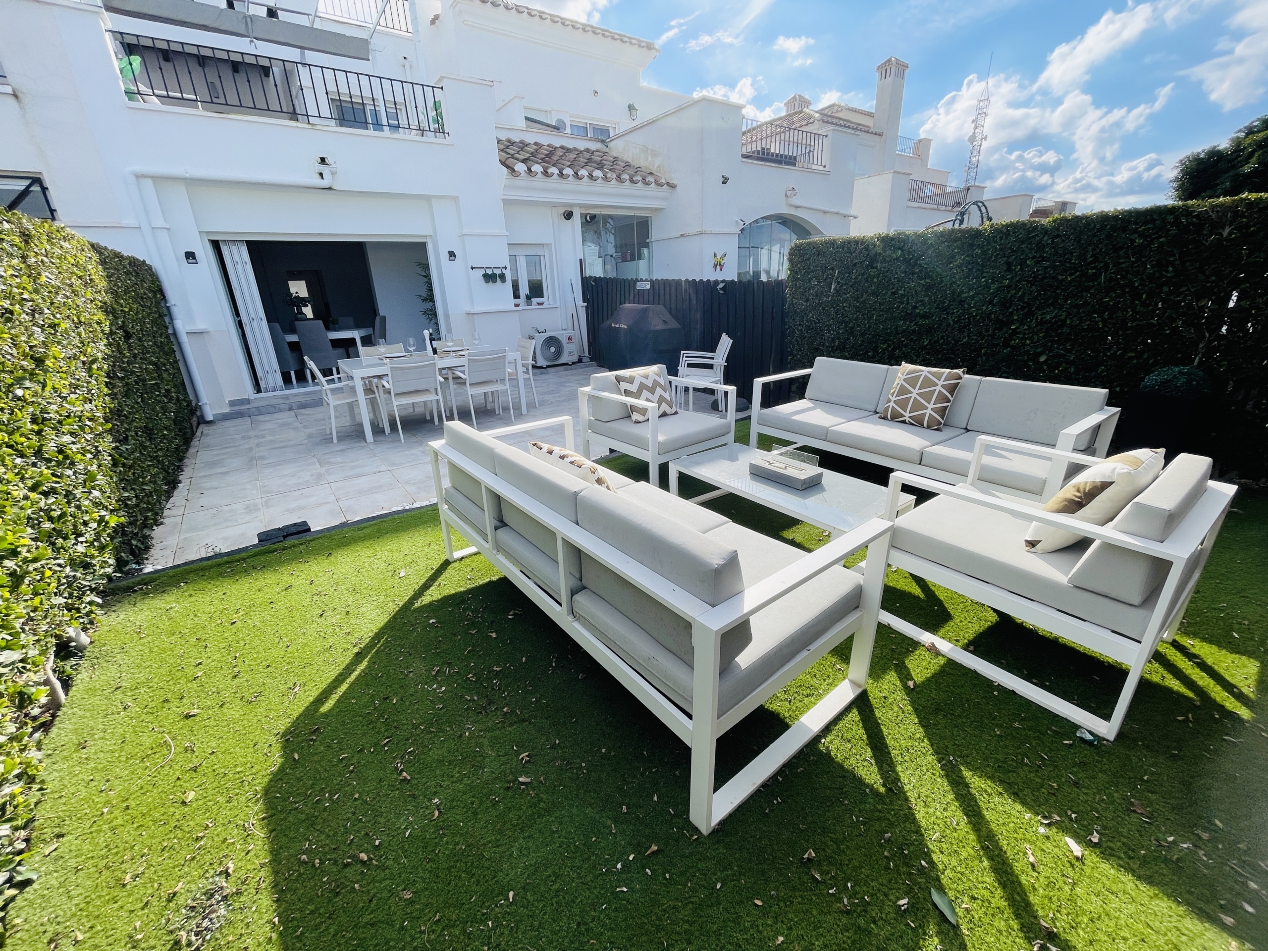 To the rear of the property, bi-folding double-glazed UPVC glass curtains open fully to reveal a generous outdoor terrace and garden area, finished with new terrace tiling and low-maintenance artificial grass—an ideal space for outdoor dining and enjoying the Spanish climate.
