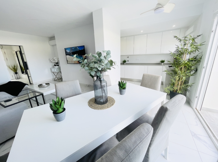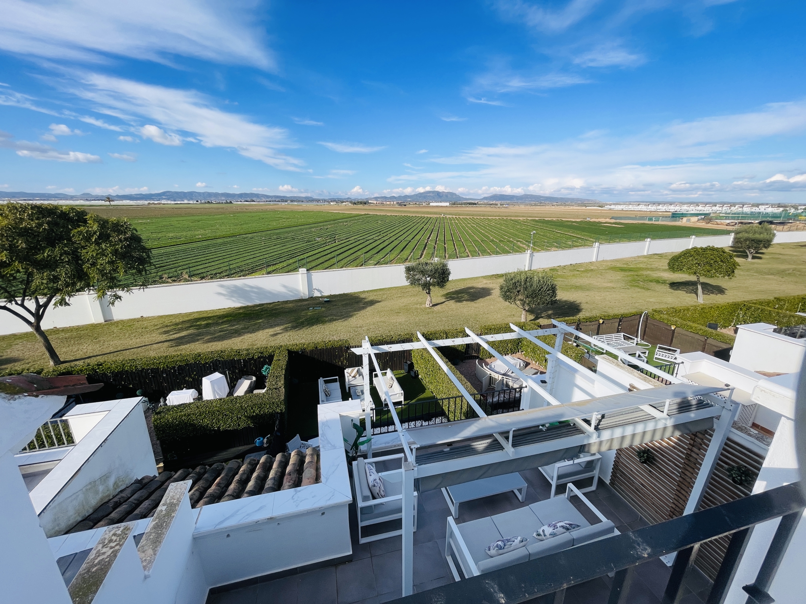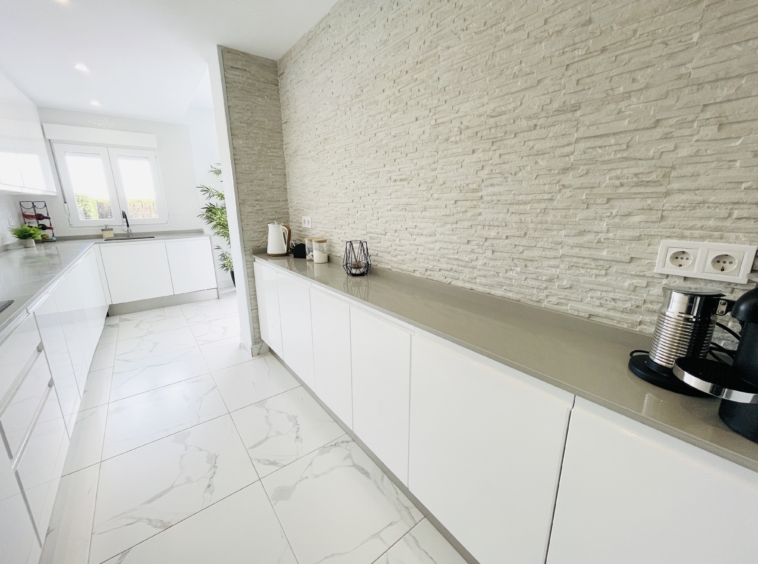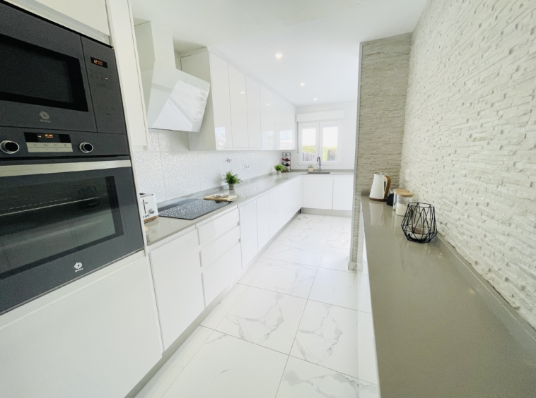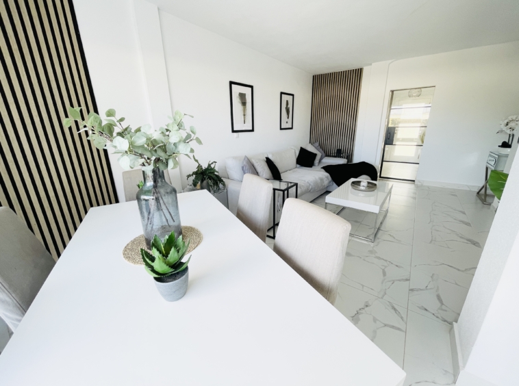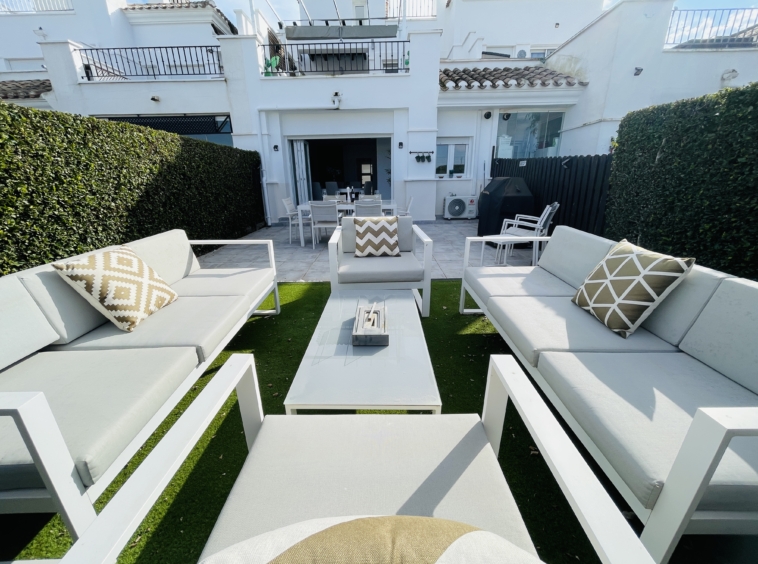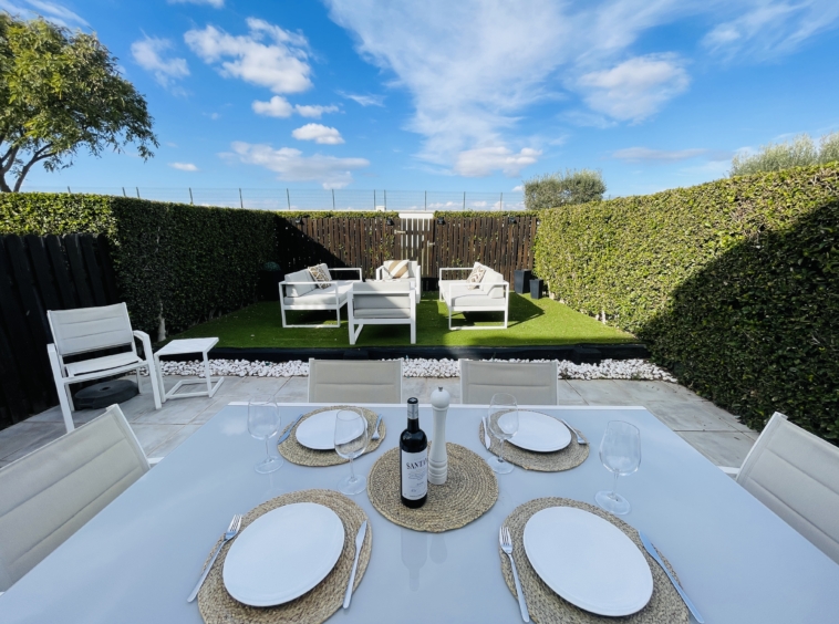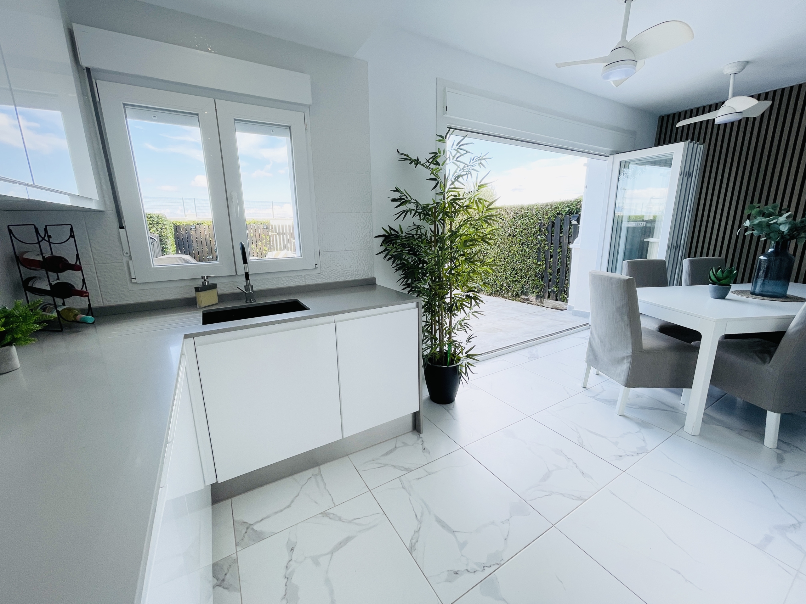 To the rear of the property, bi-folding double-glazed UPVC glass curtains open fully to reveal a generous outdoor terrace and garden area, finished with new terrace tiling and low-maintenance artificial grass—an ideal space for outdoor dining and enjoying the Spanish climate.