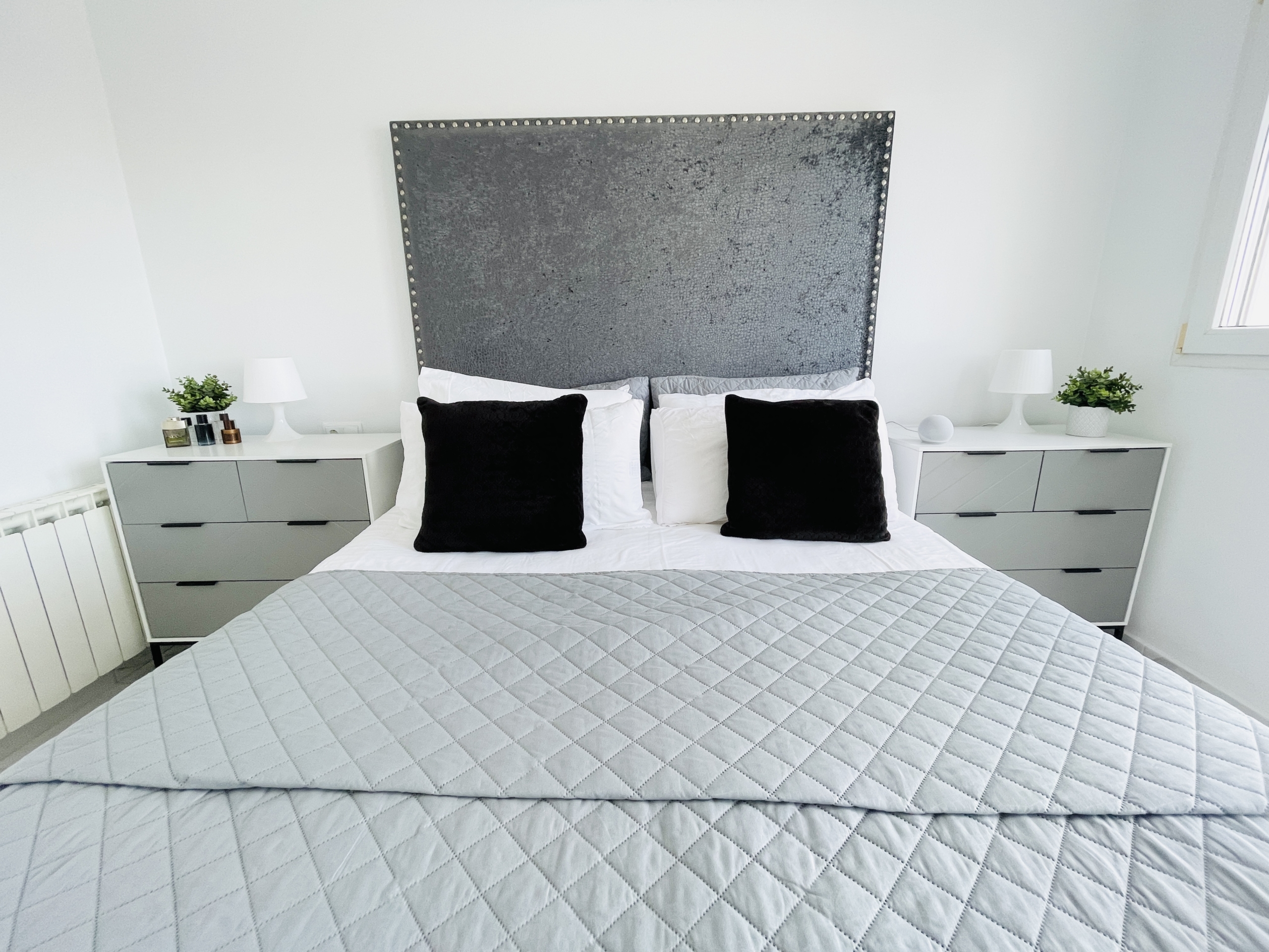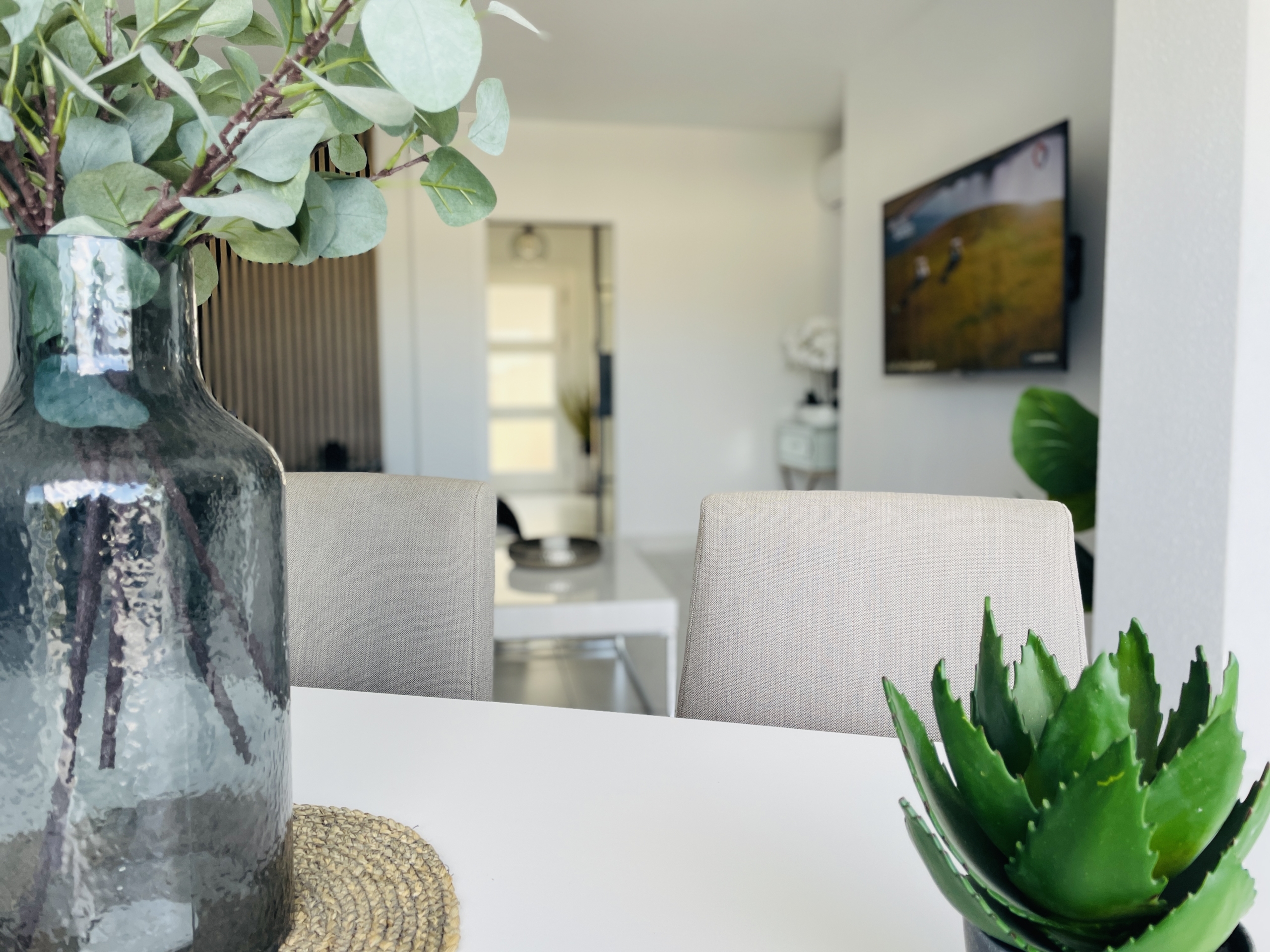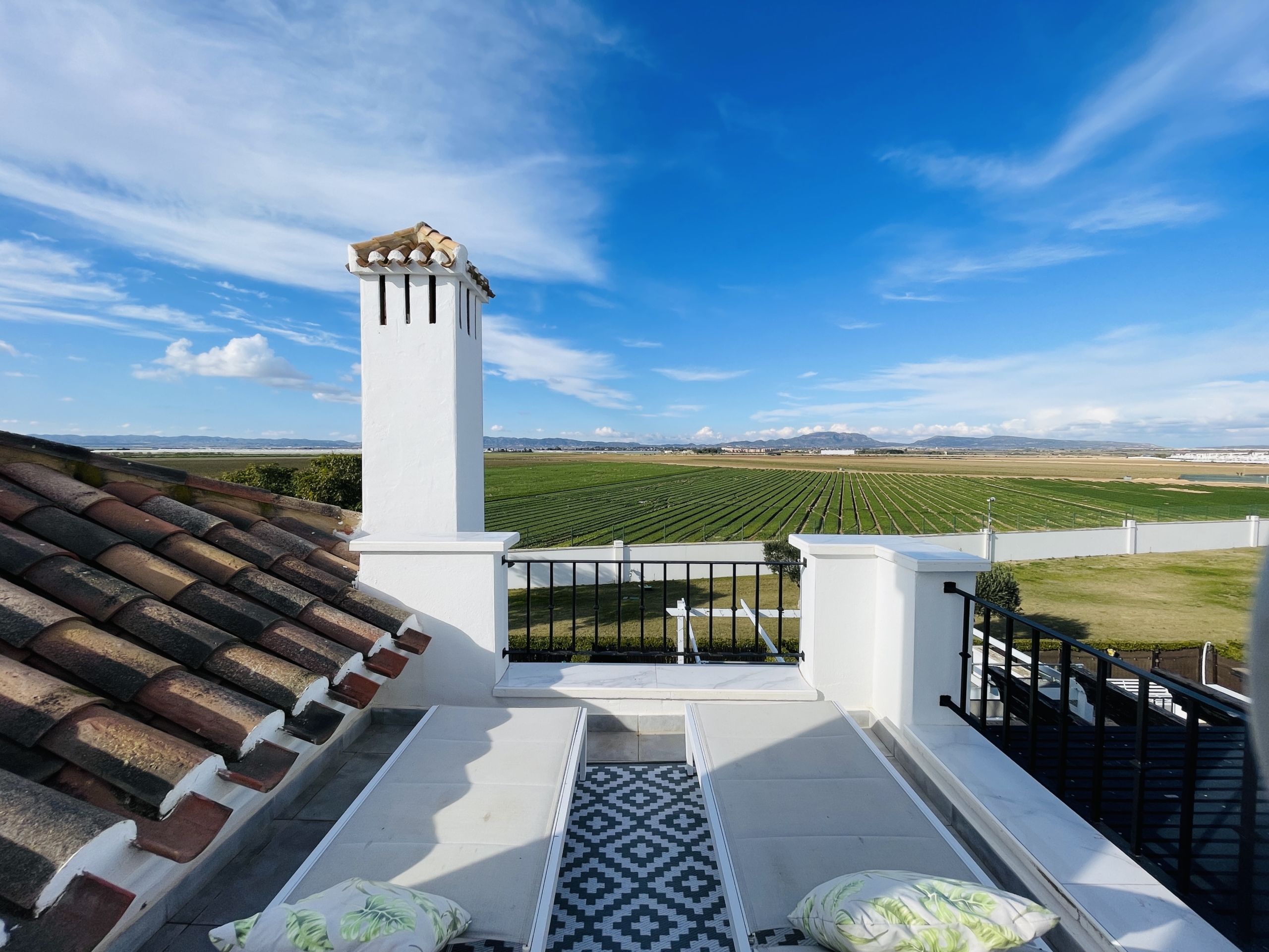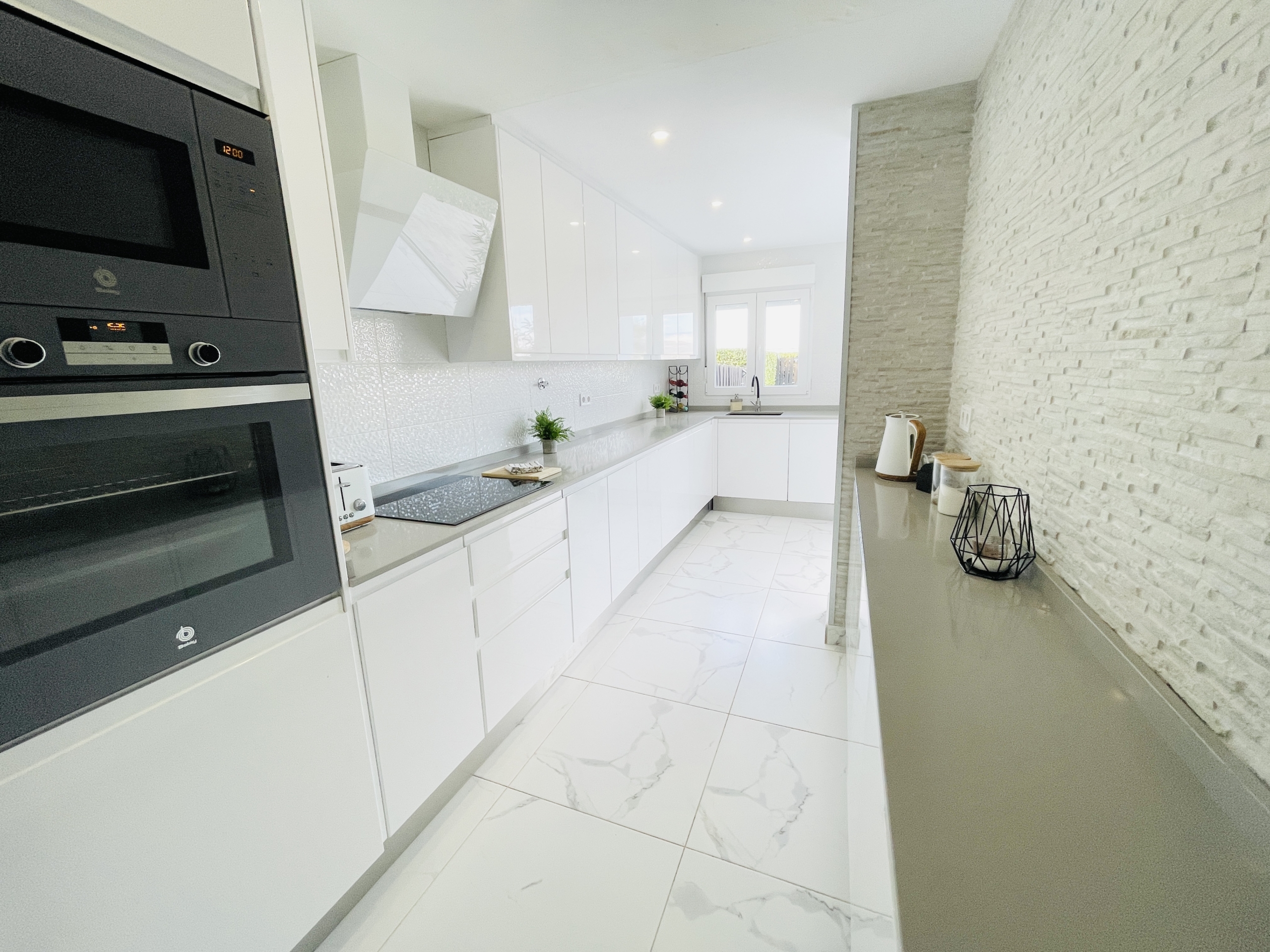 To the rear of the property, bi-folding double-glazed UPVC glass curtains open fully to reveal a generous outdoor terrace and garden area, finished with new terrace tiling and low-maintenance artificial grass—an ideal space for outdoor dining and enjoying the Spanish climate.